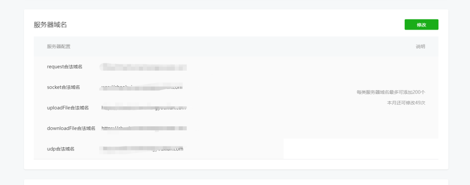 在公众平台登录小程序账号添加 服务器域名和业务域名