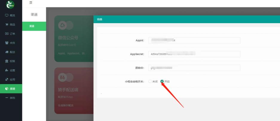 这些都保存后依次填写到后台中,提交小程序代码审核时需要把小程序审核开关打开万条优鲜