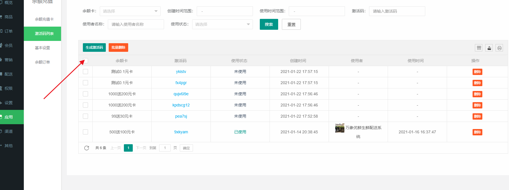 后台先添加激活码-可生成6-12位数-选择充值卡类型