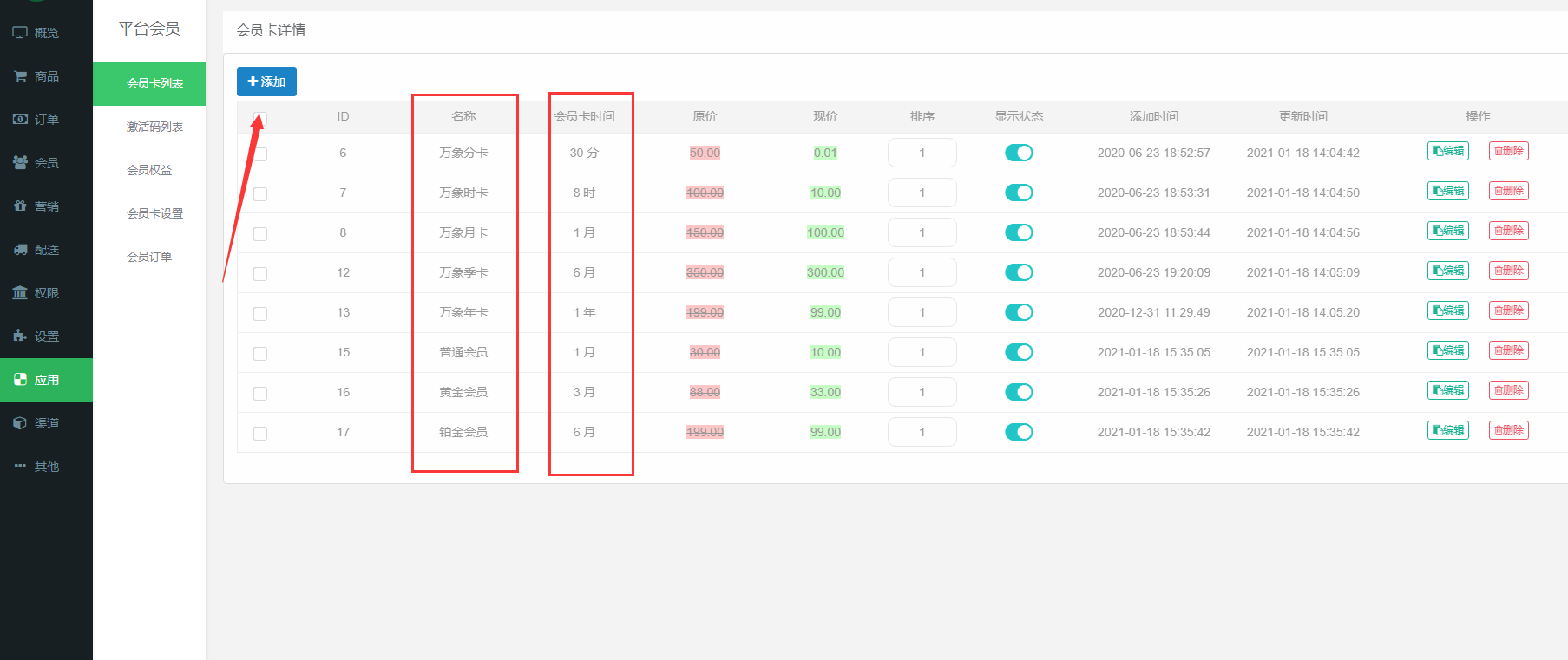 会员卡列表类型-自定义会员卡名称-会员卡开通时间为分、时、月、年会员激活码列表-商家可制成实体卡用于用户到店消费-用户手机直接输入激活码需要先添加会员卡类型后台先添加激活码-可生成6-12位数-选择会员卡类型生成激活码可以勾选批...