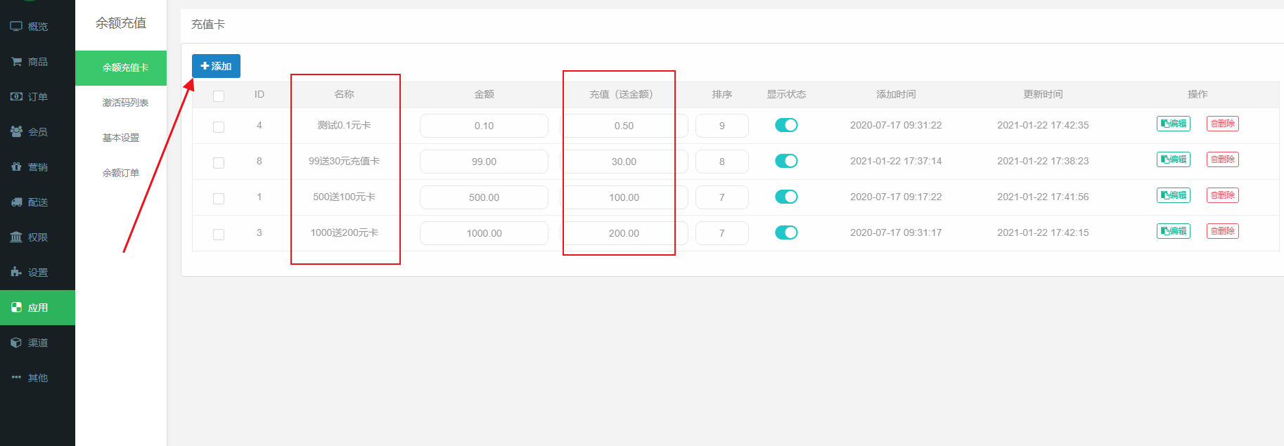 商家可制成实体卡用于用户到店消费-用户手机直接输入激活码后台先添加激活码-可生成6-12位数-选择充值卡类型添加 充值卡类型-名称前端不显示方便自己查看分辨 充值赠送添加激活码添加生成激活码可生成6-12位数 生成多个手机端我的...