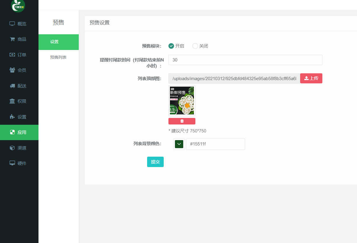 后台开启预售首页导航图 列表顶部图下单流程先支付定金-在规定时间支付尾款-(超过时间关闭订单退定金)设置预售商品支付定金后在预售列表查看-退定金-提现付尾款...