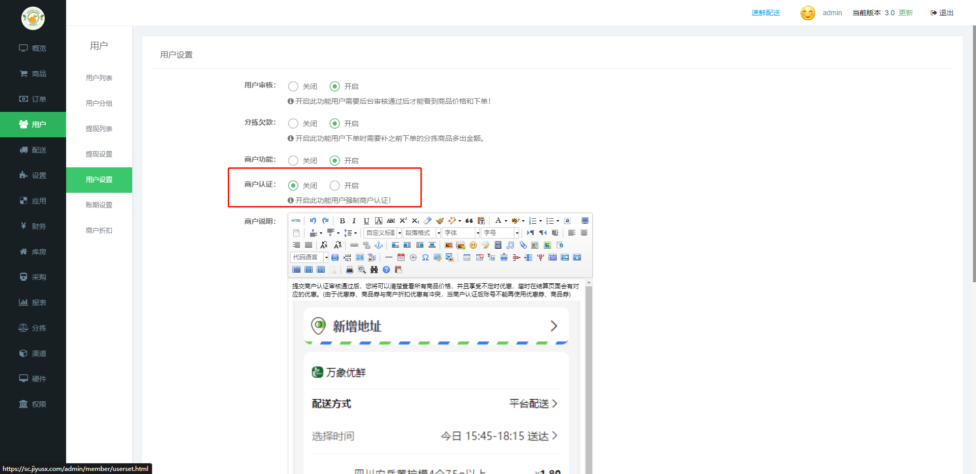 打开强制商户认证,需要后台审核资料后才可以下单只开强制商户认证,不开用户审核即可...