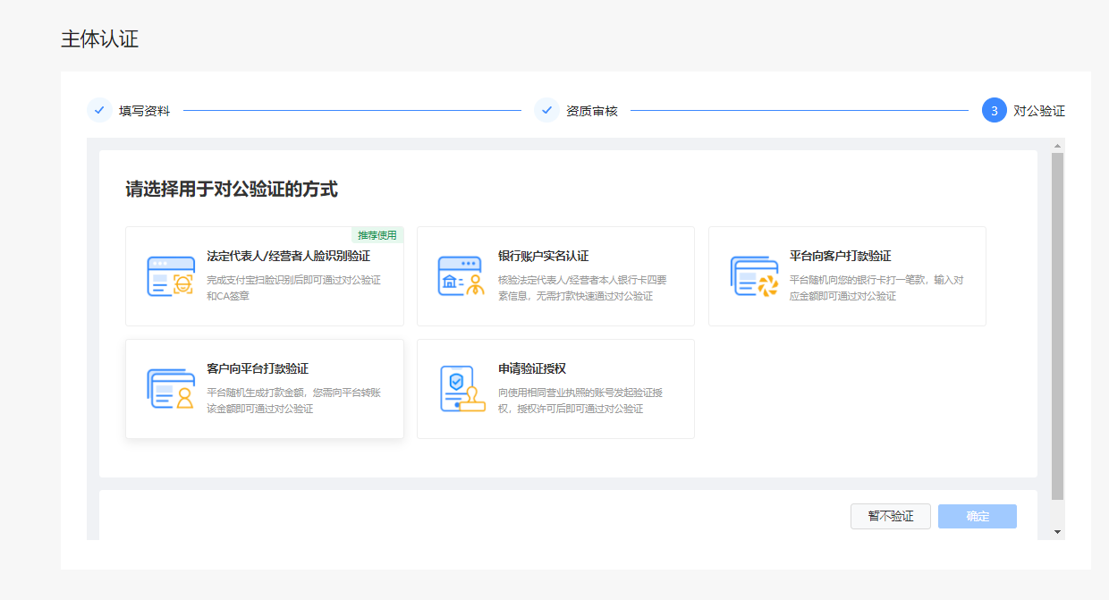 主体审核 最好是选第一个比较方便,点进去输入法人的身份证号和姓名提交后,会有一个支付宝的二维码然后支付宝扫码进行人脸识别认证