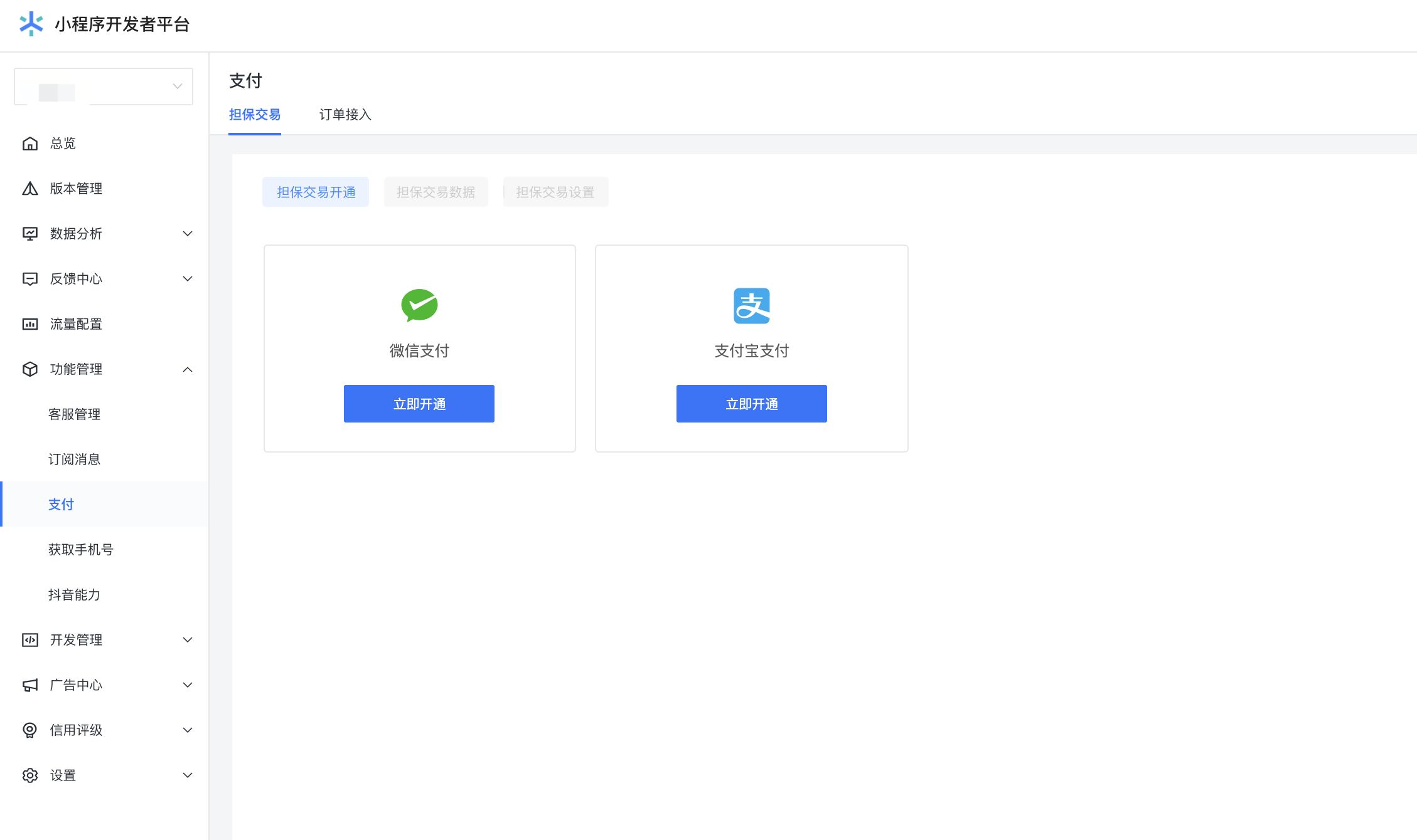 登录开发者平台,进入小程序详情页,点击「功能管理」--「支付」,企业资质通过后可申请开通支付。