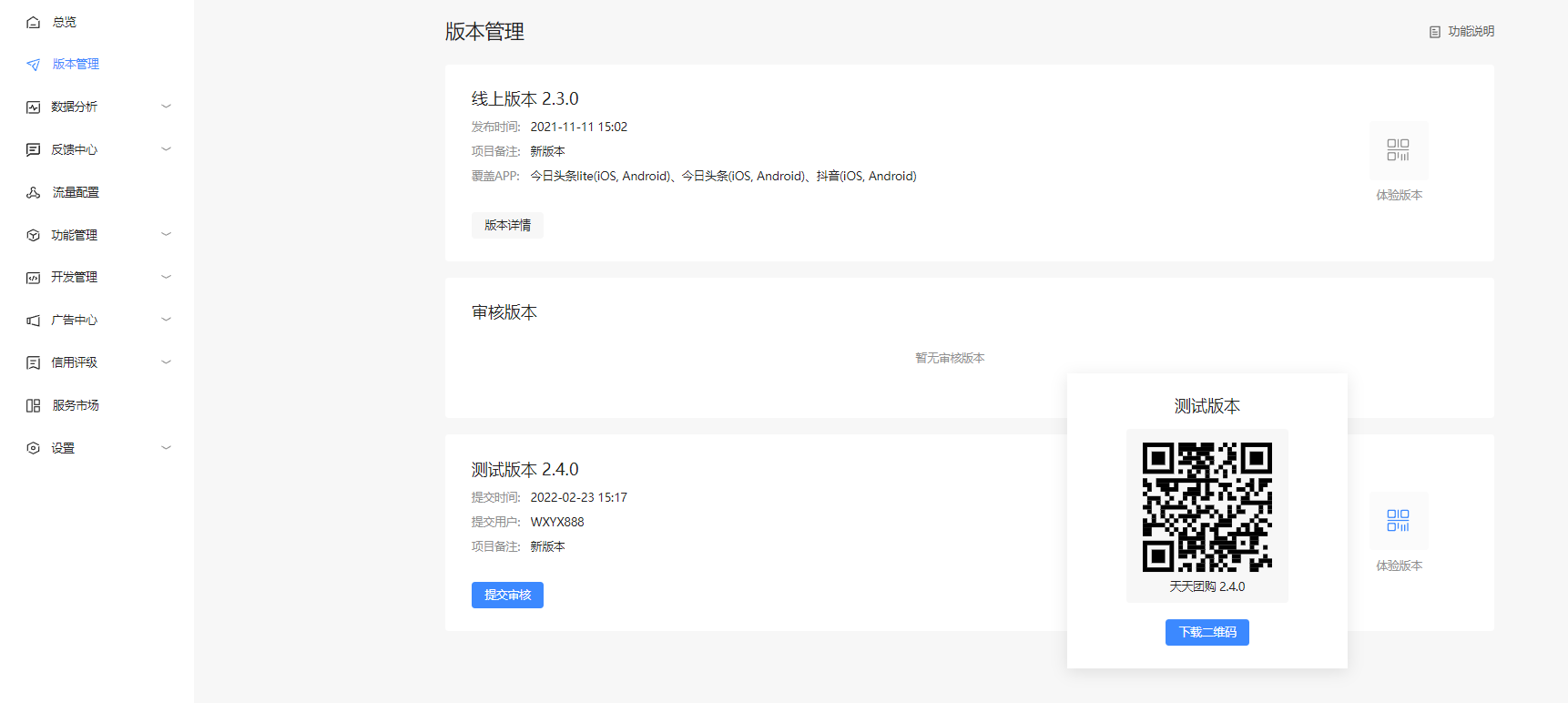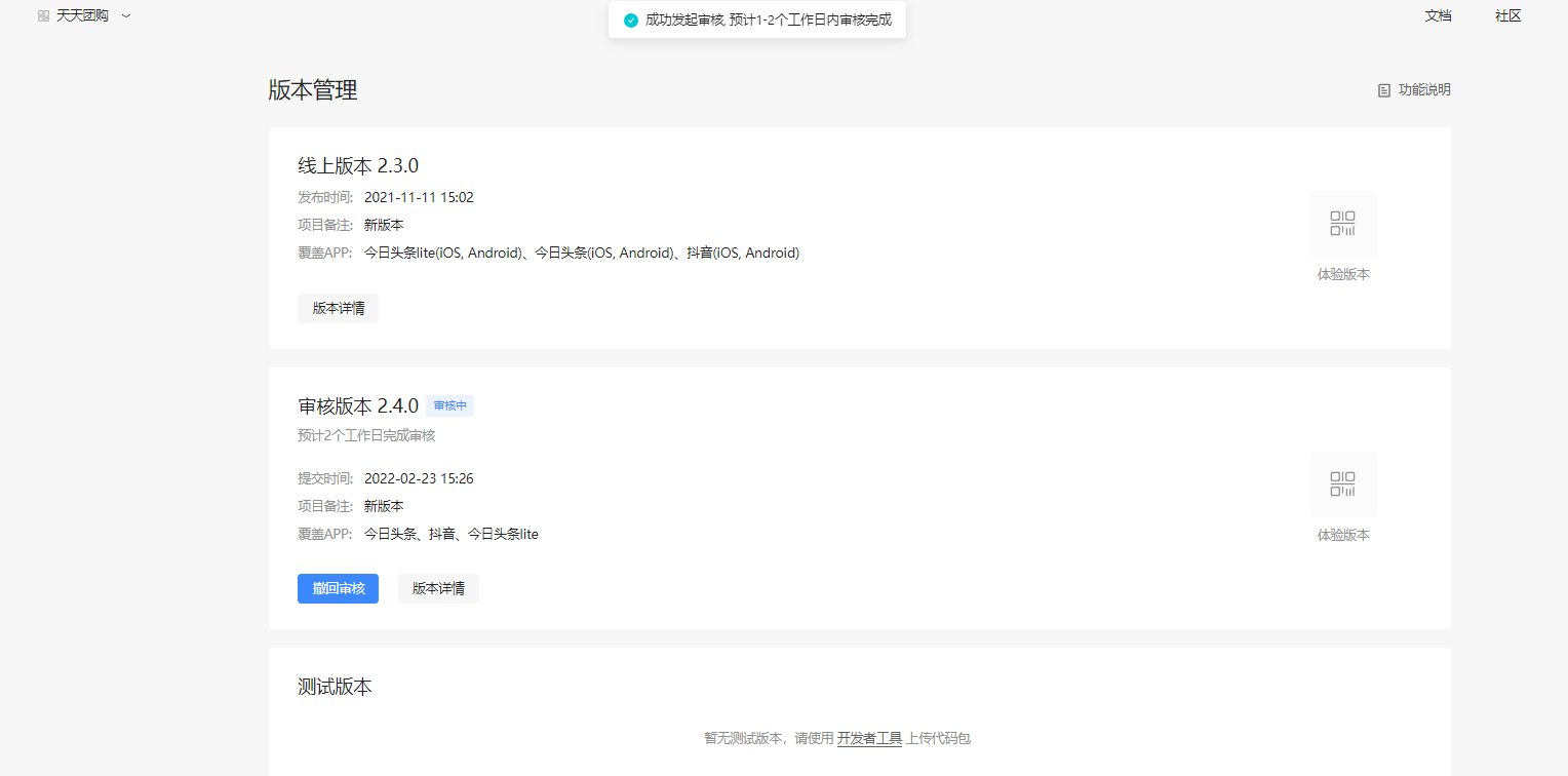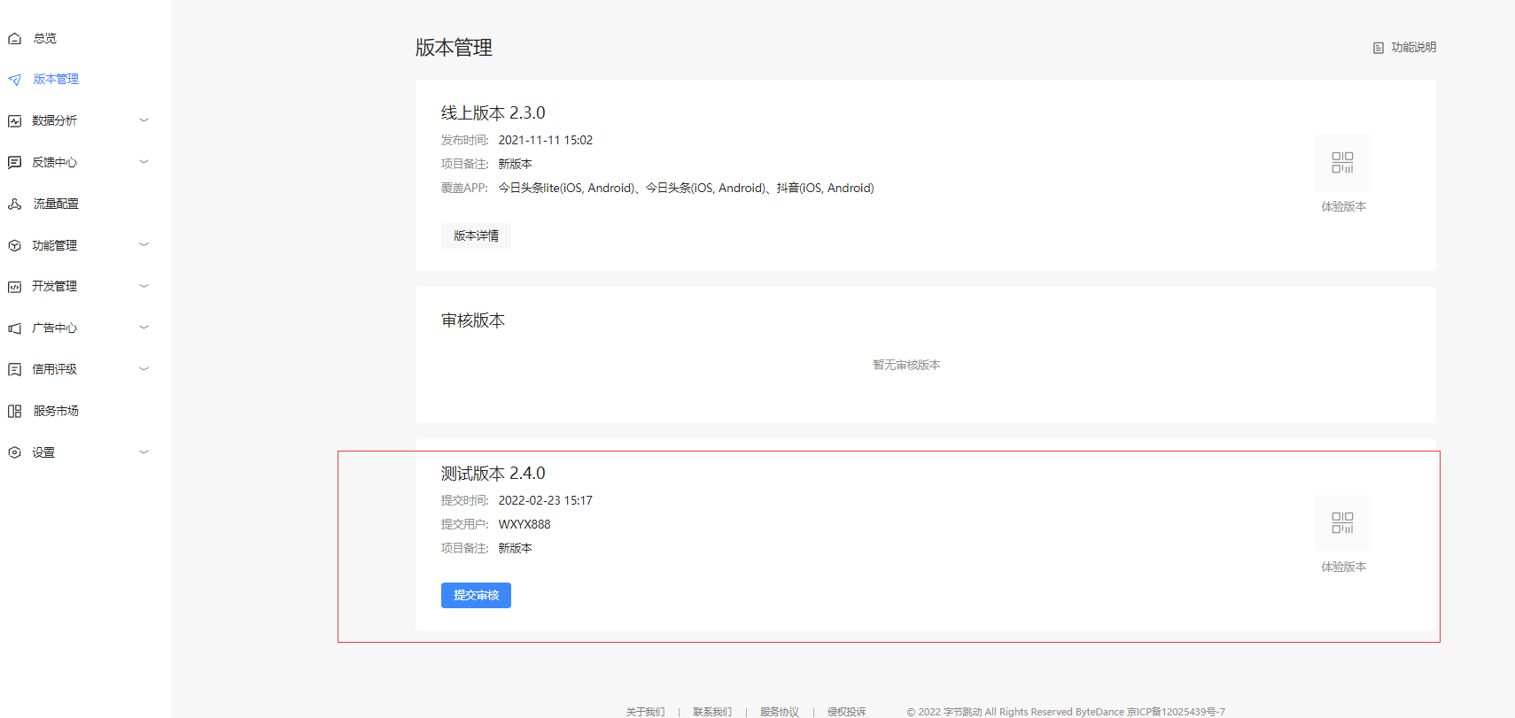 上传完版本,回到字节开发者平台,会看到有一个测试版本
